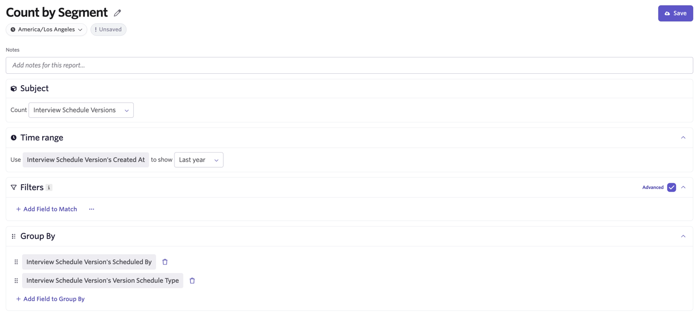 Report Type: Segmentation Subject: Interview Schedule Versions Time Range: Interview Schedule Version’s Created At Filters: Optional (can filter by job, stage, department, etc) Group By: Interview Schedule Version’s Scheduled By Interview Schedule Version’s Version Schedule Type
