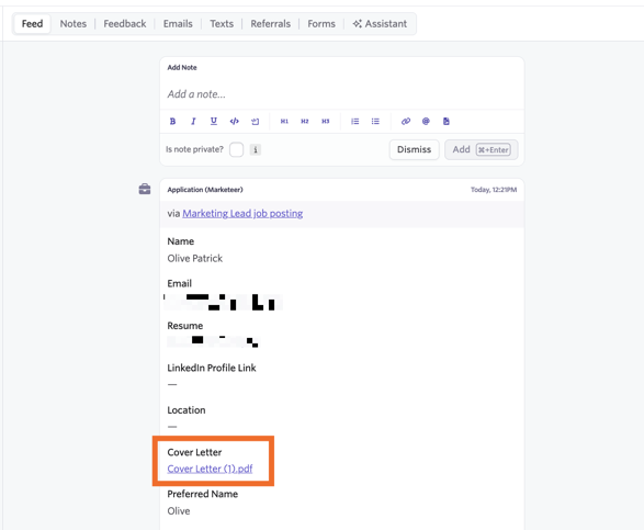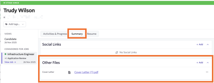 If you do not have file categories enabled, or opt to not check the Save to Profile? checkbox, then the uploaded file can be found within the Application activity on the candidate’s feed.