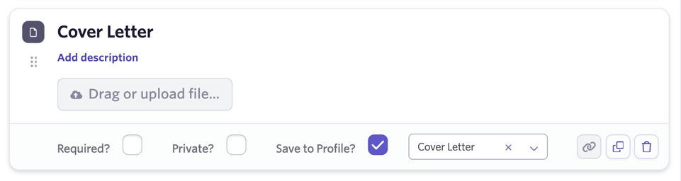 If you’d like to give the candidate the option to upload files as a part of their application, you can add a file question to an application form. More on configuring these at Application Forms.
