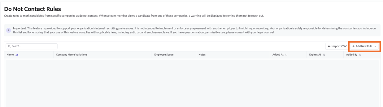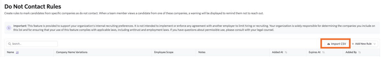 This feature is designed solely to support unilateral, internal recruiting policies. It is not intended to implement any agreement with other employers to limit hiring or recruiting. Customers control and manage all list entries and are responsible for ensuring that their use complies with applicable laws and company policies.