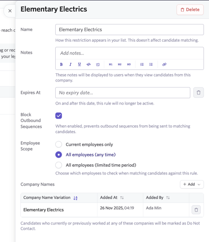 Notes Optional notes to display the reason for the rule or other important information internally. These are companies within our portfolio. Employees from these companies should not be sourced or contacted about our roles.