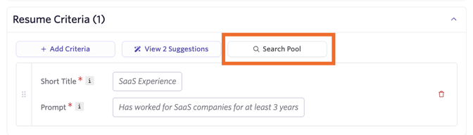 You can click Search Pool for suggestions generated by AI based on the job description in your posting. You can also use this option to add criteria previously used for other roles. Please note: You will only see the criteria previously used for only the other roles you have access to.