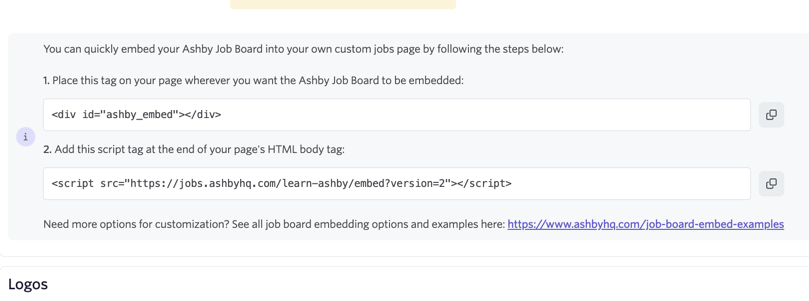 ?version=2"></script>Important: You'll need to directly link to the Ashby embed script on your careers page, as shown above. If you download the embed script and host or bundle it yourself, the script will not receive updates, and we cannot guarantee it will continue to work. For that reason, you'll need to directly link to the Ashby-hosted version of the script, as shown above.