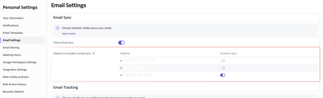 If users have the email sync option enabled, they can also opt to include personal email aliases that should also be included in the sync, so if they respond to a candidate using one of their personal aliases in their email client, it will still be detected and synced to Ashby.