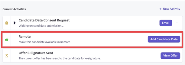 Once an offer has been approved or accepted, the option to push the candidate to Remote will show in the Activities & Progress section of the candidate profile.