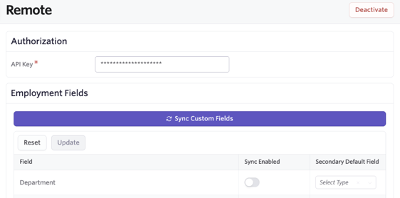 Once the integration is enabled, the Remote fields can be synced over to the integration tile in Ashby. You can then use the Sync Enabled toggle to determine the fields you’d like to sync, then click Sync Custom Fields to create those offer custom fields within Ashby. These fields can then be completed at the offer stage so the data is pulled to Remote when the hired candidate is pushed.